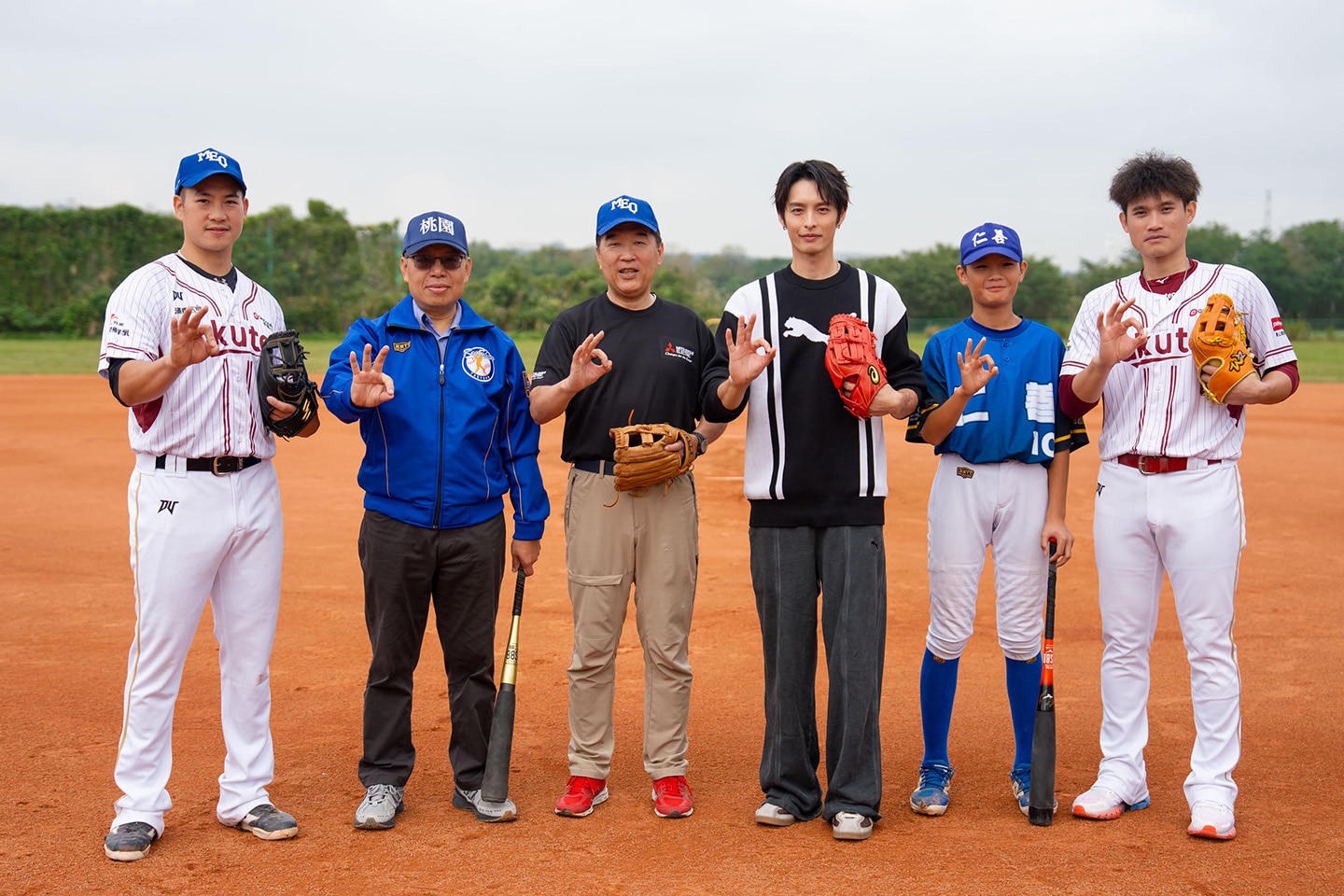 (照片左起: 樂天桃猿棒球隊球員 梁家榮、仁善國小校長林繼鴻、台灣三菱電機董事長暨總經理大河內一彦、活動大使曹佑寧、仁善少棒隊代表 林啟堯、樂天桃猿棒球隊球員 林承飛)