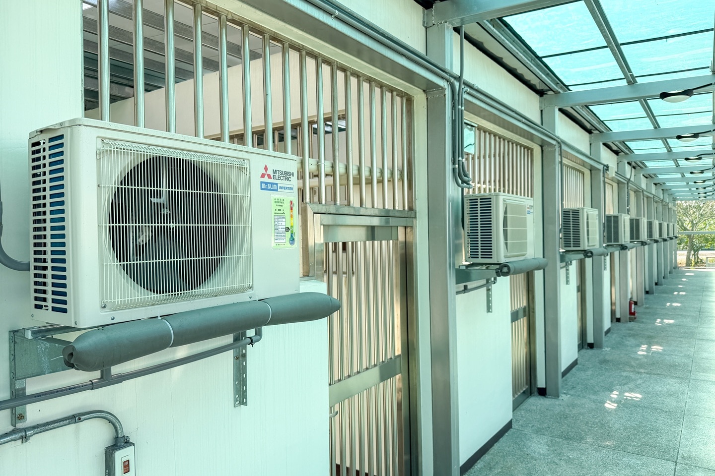 - 家用空調:採多角形熱交換器設計、新型風車葉輪與優化葉片間距,實現低至19分貝超靜音運轉;室內外機採防污耐蝕強化處理,耐用且便於維護,適合長時間運轉空間,打造舒適的人犬寢室環境,讓高度訓練後的訓練員與犬隻皆能獲得良好休息品質。各空調設備更通過三菱電機嚴謹的四大品質標準把關,包含出廠前100%全數測試運轉,確保長期使用下仍能維持穩定效能與可靠品質。
